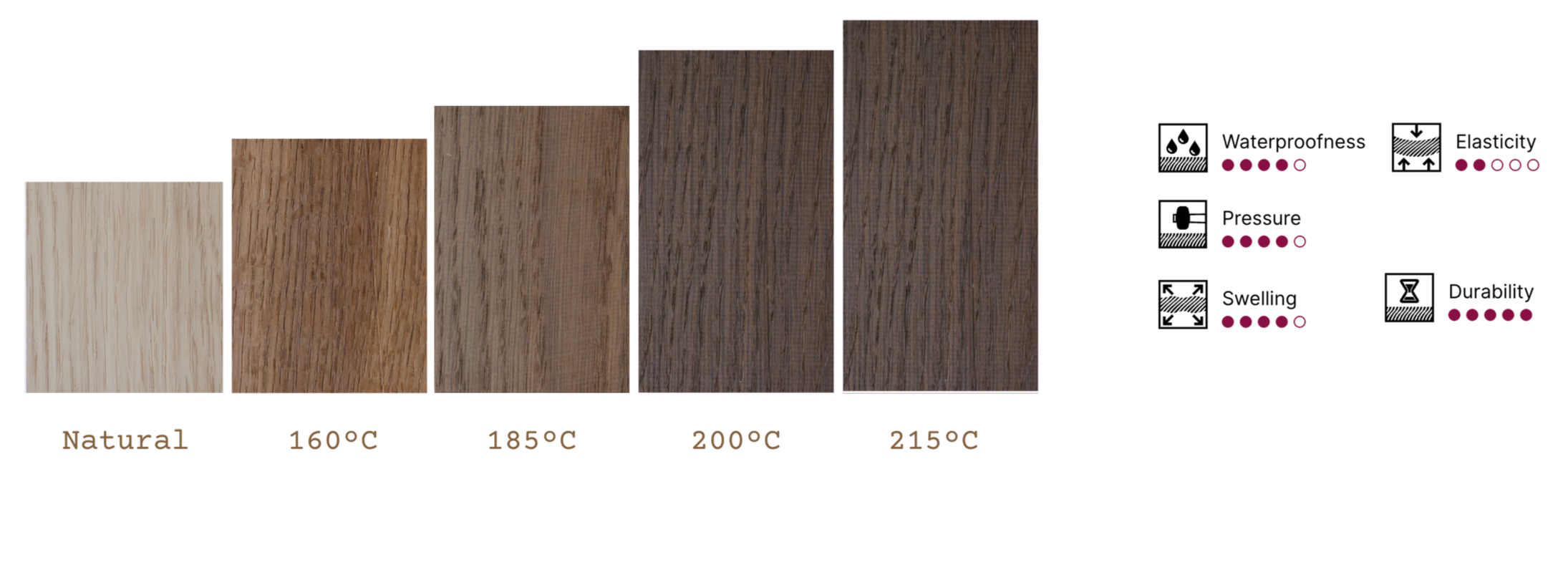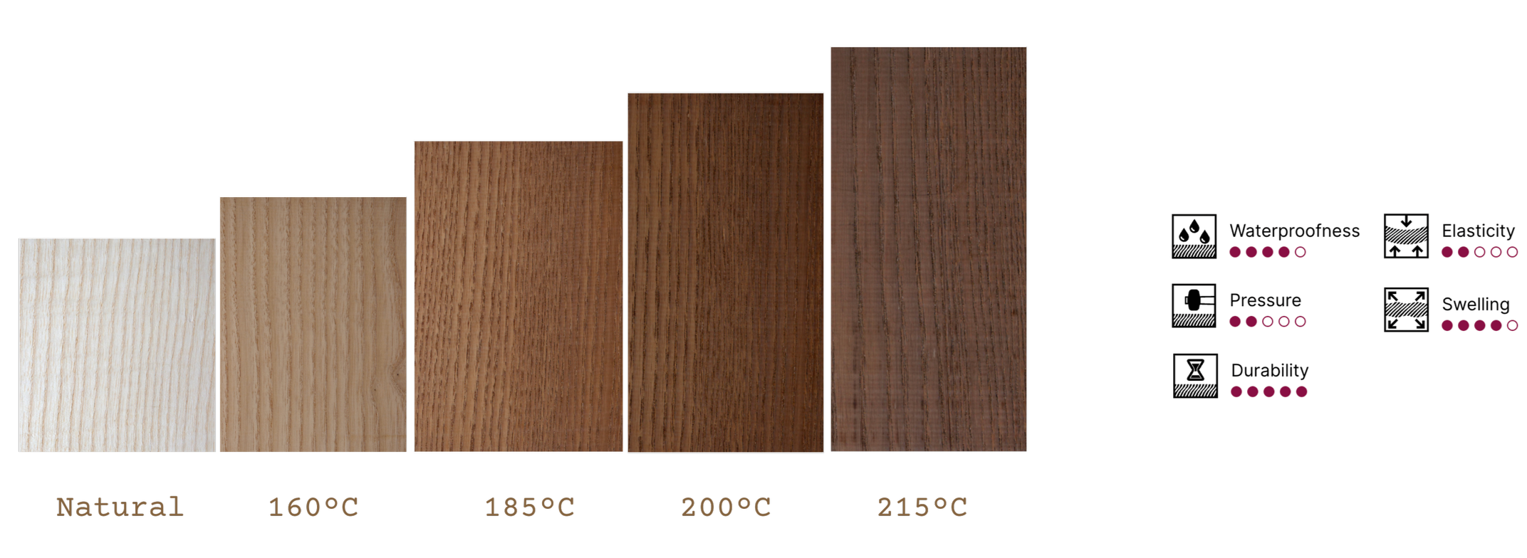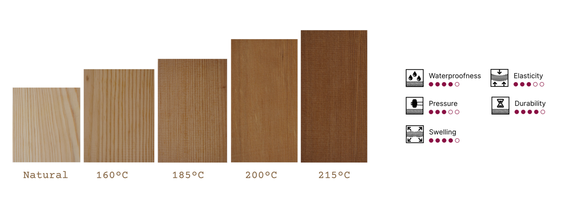 Through a controlled, high-temperature, heat-only process, the cellular structure of the wood is permanently altered to reduce hygroscopic behavior—meaning the material absorbs less moisture, swells less, and performs more consistently across changing climates. This process improves resistance to biological decay while maintaining the inherent strength and workability of each species.