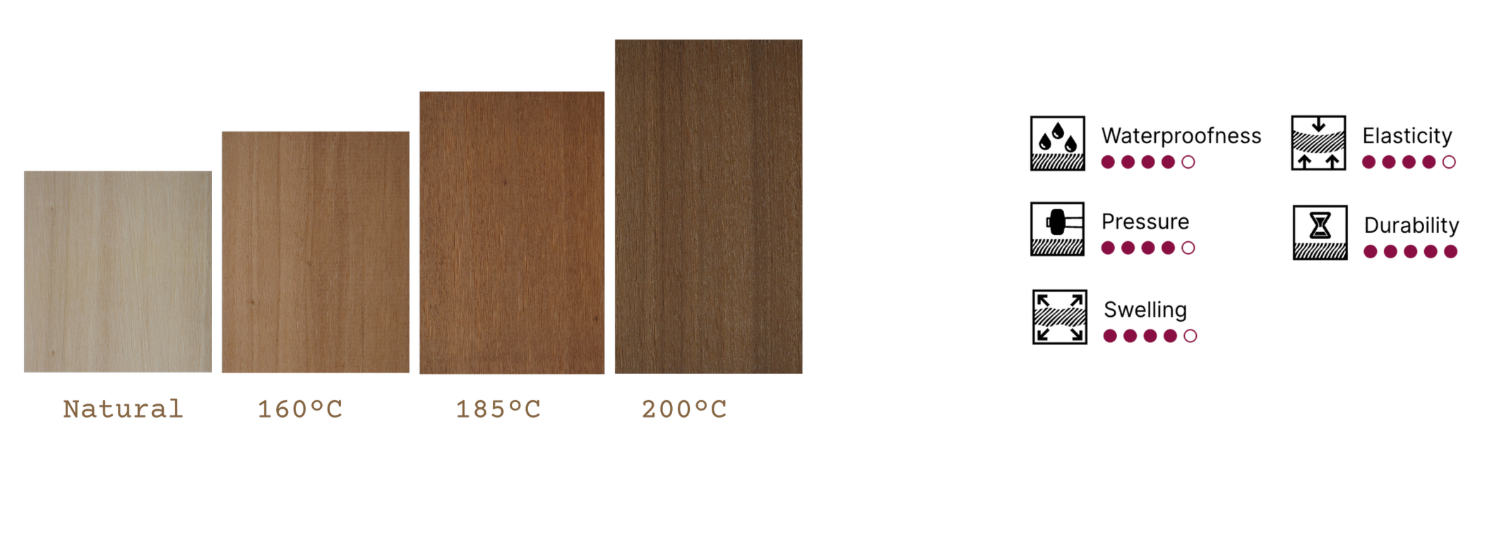 Poplar is a lightweight, highly workable hardwood that responds exceptionally well to thermal modification. The heat treatment significantly reduces moisture absorption and swelling while increasing durability, transforming Poplar from a low-durability species into a stable, high-performance architectural material. It offers a smooth grain and a uniform, warm brown tone as treatment temperatures increase.